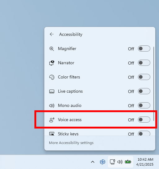 And we are also including voice access under the Accessibility flyout via quick settings in the system tray of the taskbar.
