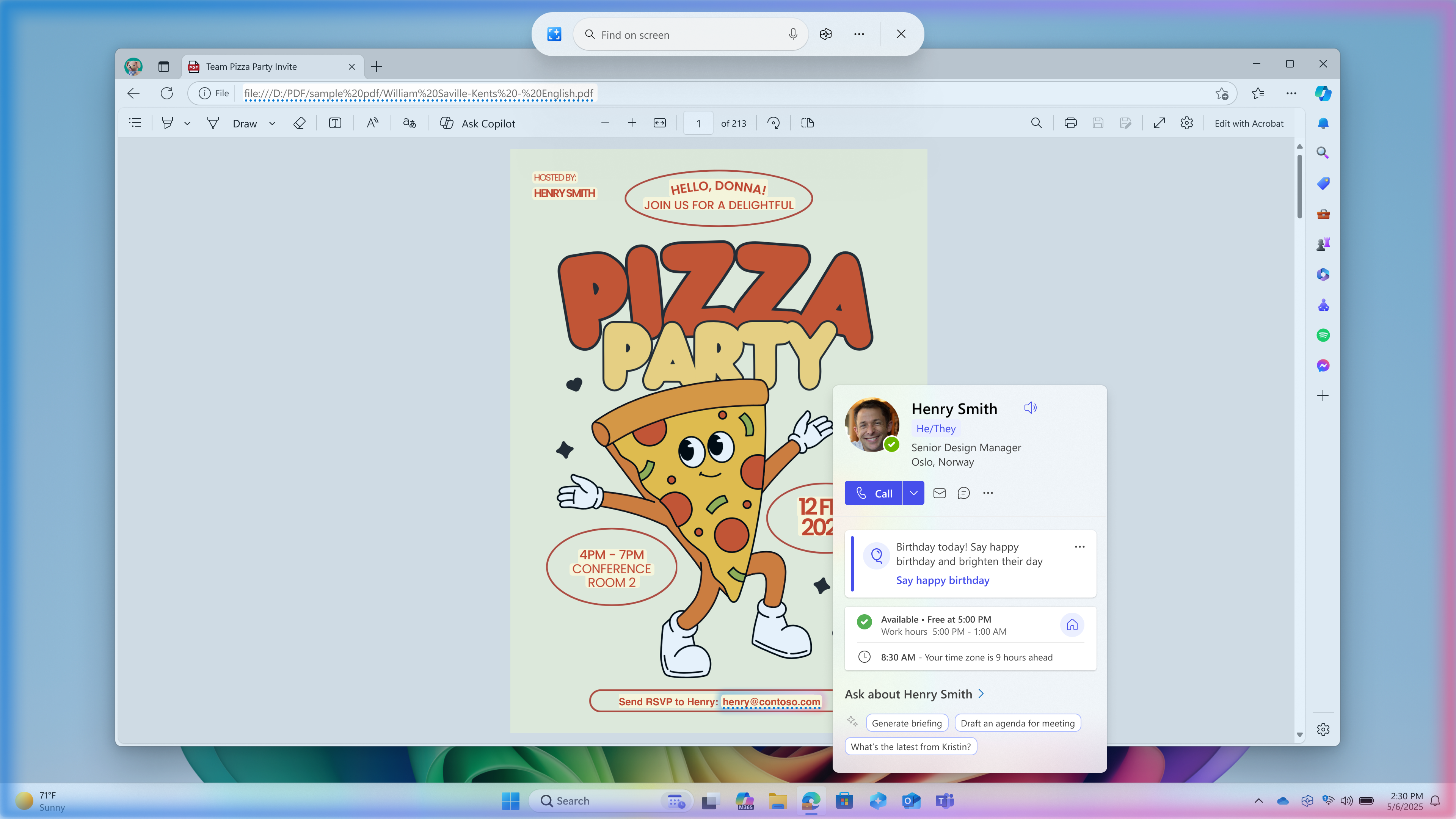 View Microsoft 365 Profile Cards: Rather than opening Microsoft Outlook or Teams or anywhere to look up someone’s profile, get straight to their info about them thanks to the integration of Live Persona Cards for from Microsoft 365 in Click to Do. See how to contact them or past collaborations without leaving your flow. This new action is available on emails seen in Click to Do. Press Win + Click right on an email and, if it’s part of your work or school’s organization, the profile card is displayed.