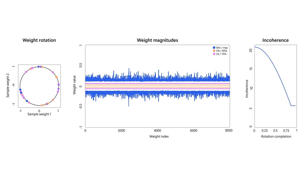 - Incoherence processing: Previous weight-only quantization methods such as QuIP and QuIP# employ rotations to pre-multiply and post-multiply the weight matrices (and Hessians). A weight matrix has high incoherence when its largest element is an outlier relative to the average element’s magnitude, making it difficult to quantize. Incoherence processing reduces the incoherence in weight matrices by rotating them to make quantization easier. However, this comes at an increased computational cost of rotations and de-rotations for each weight matrix.