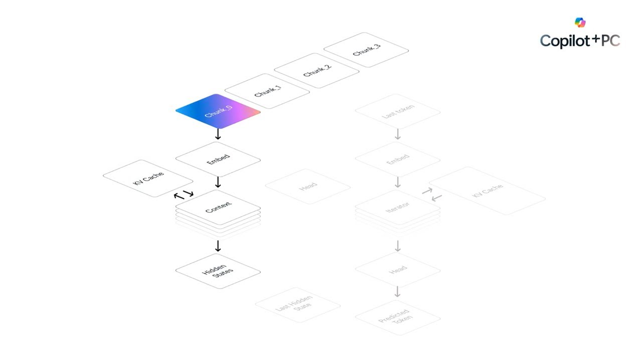 Dynamic and shared KV cache: A context processor that runs wholly on the NPU but has a read-only key-value cache is highly efficient, but this limits the context length to the sequence length of the context processor. We experimented with different ways of splitting context processing across the NPU and CPU to find a good balance of speed and flexibility. The best configuration involved doing only the GroupQueryAttention operation on the CPU. This enabled a read-write, dynamic-sized KV cache for context-processing, which can then be expanded during iteration for token generation. A dynamic-sized read-write KV cache can be shared across context processing chunks, which maintains history, but also across context processing and token iteration which improves memory efficiency. Input/Output binding pre-allocates sufficient memory during context processing and enables context processing and token iteration to share a single KV cache efficiently; this improves runtime latency significantly. Memory efficiency of KV cache management is crucial because the context KV cache scales quadratically with the context length.