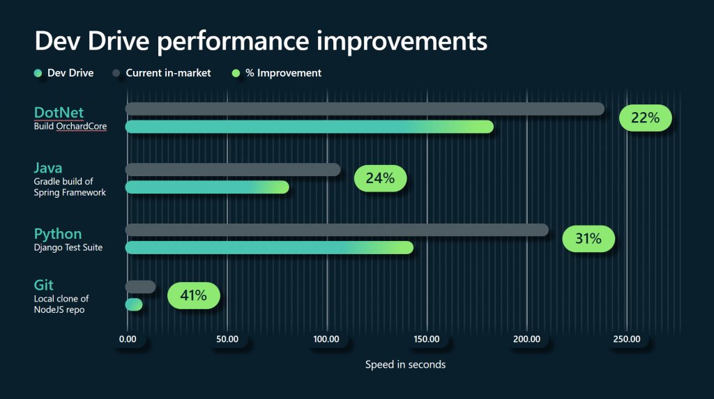 We are excited to introduce Dev Drive! A new storage volume optimized for developer workloads that delivers performance, security, and control. Dev Drive is built on the Resilient File System (ReFS) and combined with the new performance mode capability of Microsoft Defender Antivirus, provides up to 30% better performance for overall build times compared to current, in-market Windows 11 (22H2).