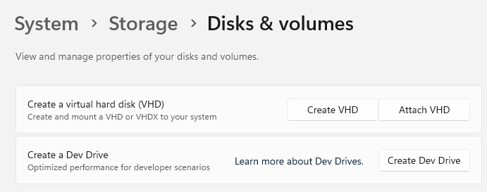 Previously the “Disk Management” tool was used to set up and maintain disks. Now we have the same functionality with the modern Settings app. You can do everything you need to do to create a Dev Drive, including creating a new volume, creating & attaching a VHD, shrinking or expanding disk sizes, and creating partitions, all in one place.