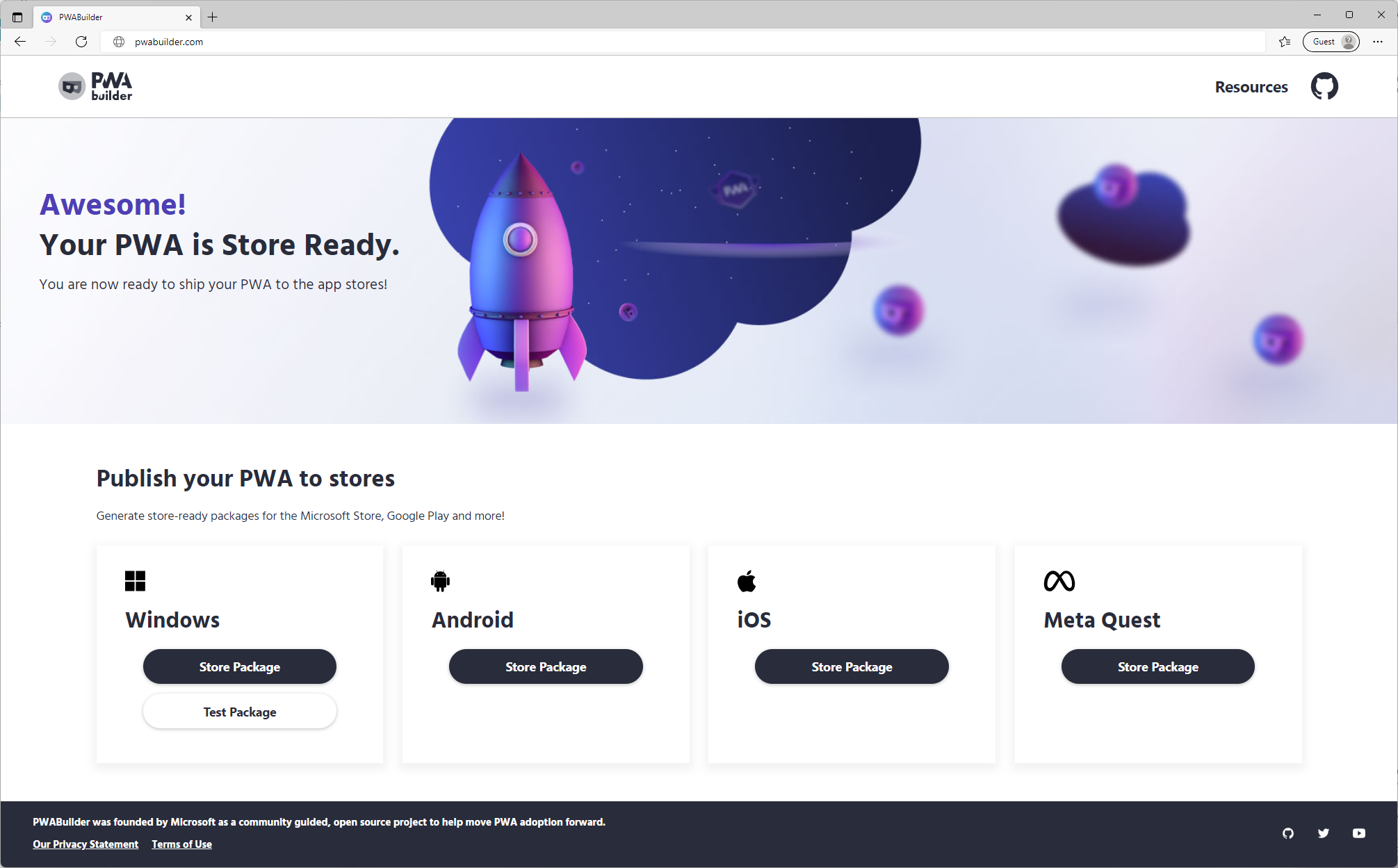 Over the past years, PWABuilder.com has been the best resource and tool to learn, get started, build, and package quality PWAs and distribute apps to Microsoft Store or other marketplaces.