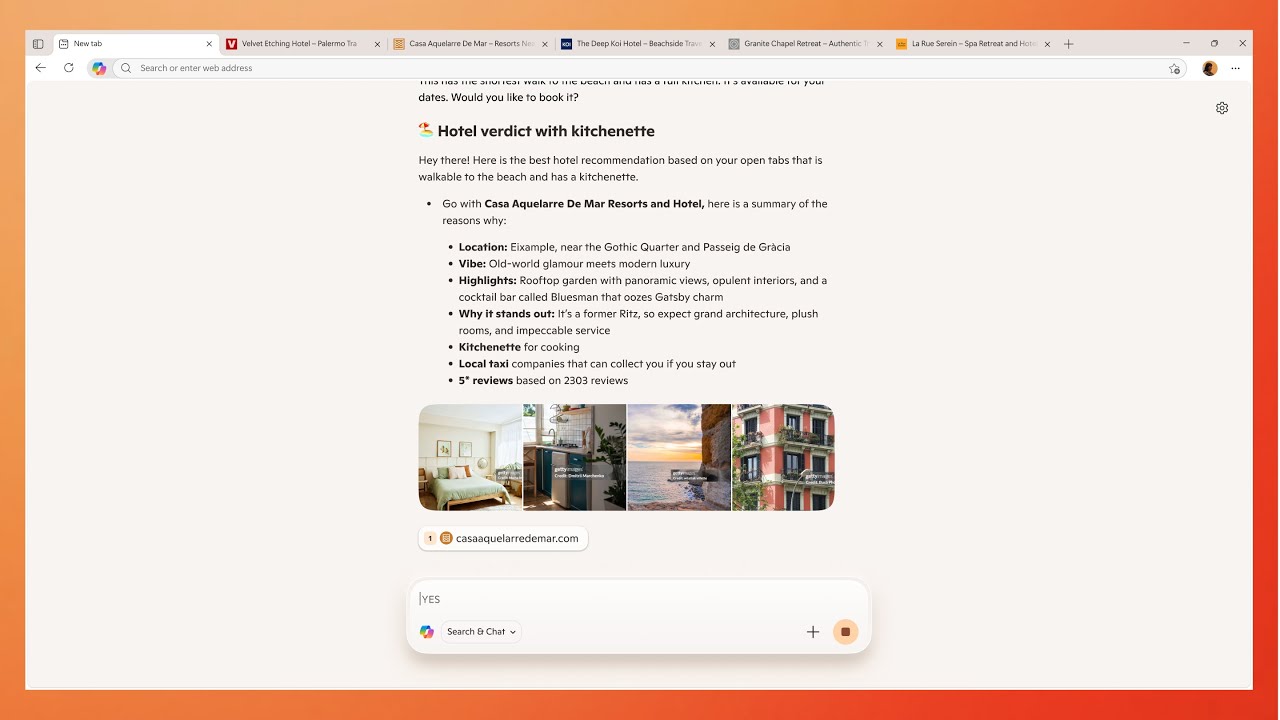 With your permission, you can let Copilot see all your open tabs so it can understand the full context of what you’re exploring online. This means better comparisons, faster decisions and less tab toggling. For example, when researching vacation rentals across multiple sites, chat with Copilot to quickly identify which option is closest to the beach and includes a full kitchen – saving time and reducing friction.
