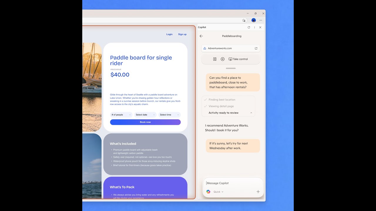 Coming soon, you will be able to give Copilot permission to access the additional browser context it needs, such as your history and credentials, to take more advanced and seamless actions – like booking reservations or managing errands on your behalf. Imagine simply asking, “Find me a paddleboard rental near work,” and Copilot not only finds the best option, but checks the weather, makes the booking and even suggests sunscreen or tutorial videos to help you prepare.