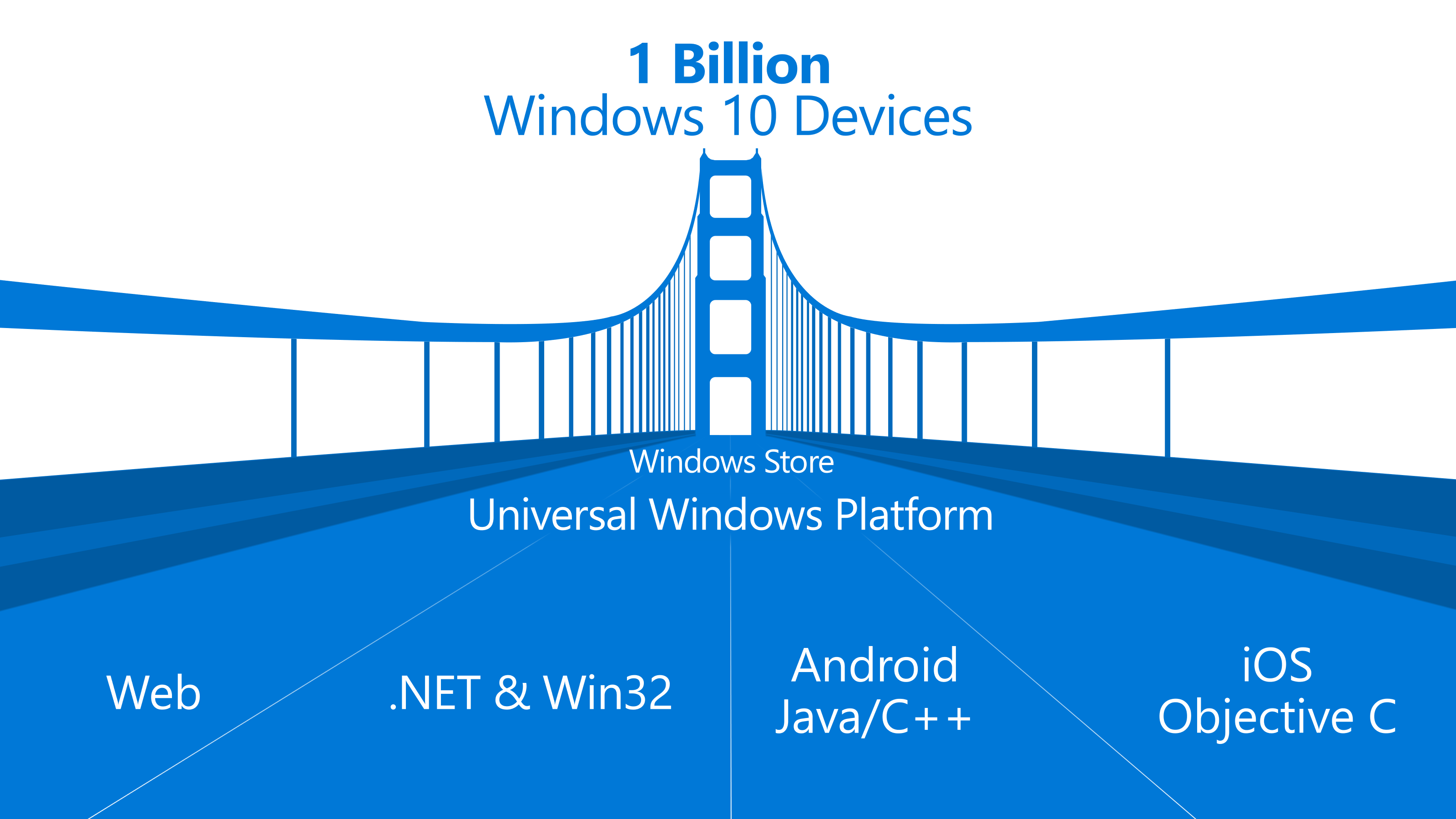Today, we announced four new SDKs, enabling developers to start with an existing code base, integrate with the Universal Windows Platform capabilities, and then distribute their new application through the Windows Store to the one billion Windows 10 devices. The code bases enabled by these SDKs are: