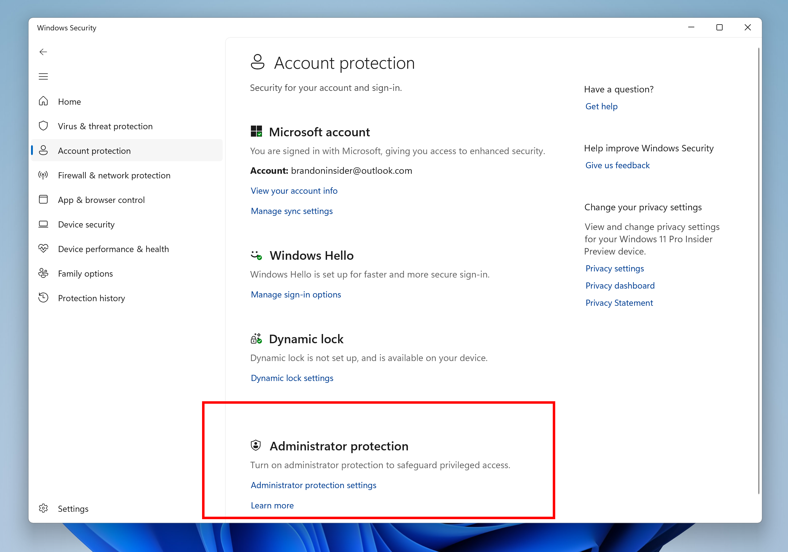 - Administrator protection can now be enabled from Windows Security settings under the Account Protection tab. This allows users to enable this feature without requiring help from IT admins. It also allows Windows home users to enable Administrator protection via Windows Security settings. Changing this setting requires a Windows reboot.