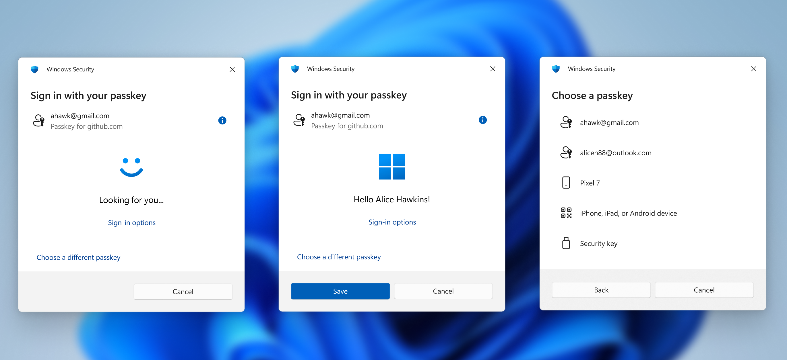 Revamped Windows Hello credential user experience for passkeys and the new administrator protection experience: We redesigned Windows security credential user experience for passkey by creating a cleaner experience that supports secured and quick authentication. Users will now be able to switch between authentication options and select passkey/devices more intuitively.