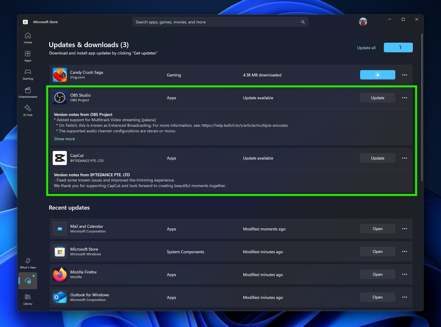 For Win32 apps that are “provided and updated” by their publishers, the Microsoft Store will now support updating directly in the Store. Previously, these apps could only be updated outside of the Microsoft Store. Insiders can head to the Downloads page and click Get Updates. If any installed apps of this type have updates, it’ll be displayed on the pending list. You can perform the update by clicking the update button; it won’t start automatically.