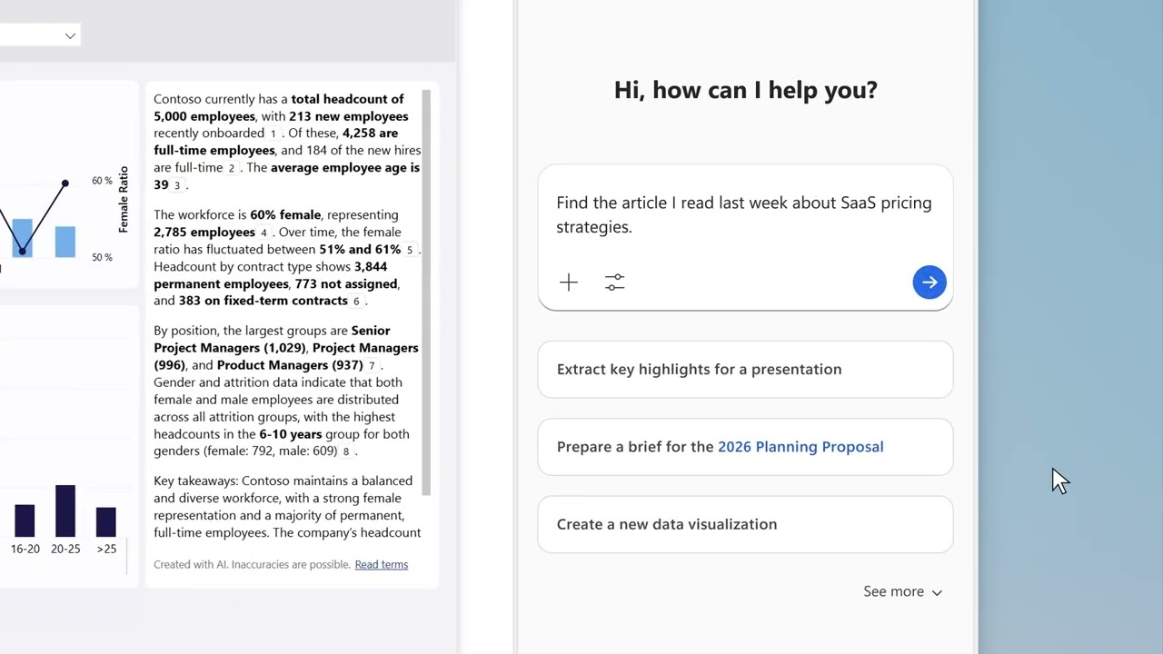 The Copilot-inspired new tab page combines search and chat in one intelligent box, and offers quick access to files, calendar, and personalized prompts—keeping everything your workforce needs at their fingertips. It’s also the starting point for the Daily Briefing—a curated summary of meetings, tasks, and priorities based on browsing tabs and the graph. No more digging through emails or juggling apps—your workforce can stay focused on what matters most.