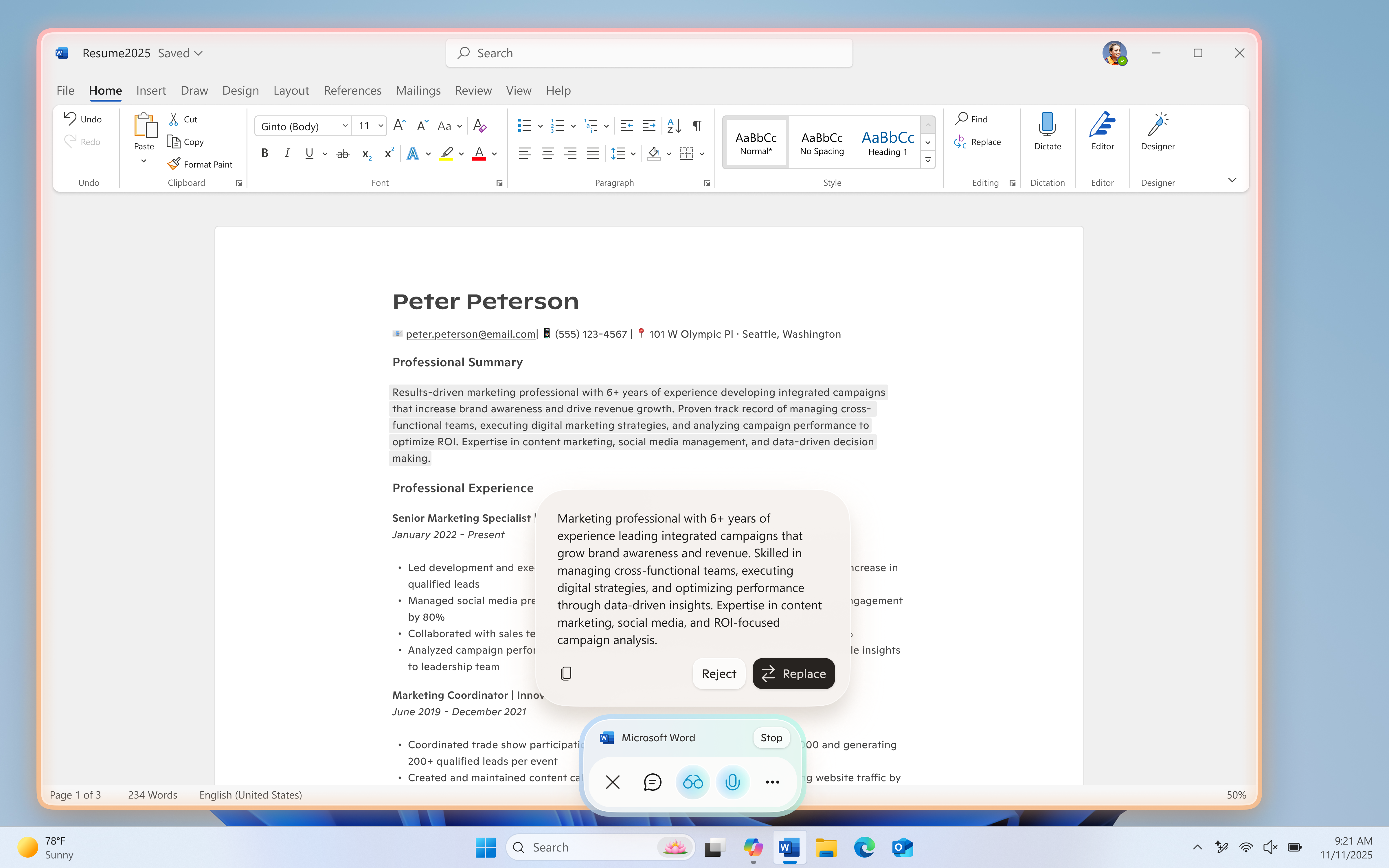 Copilot Actions for Text Editing: Windows Insiders can use Copilot to rewrite, refine, or edit text in real time during Copilot Vision sessions, enabling smooth, in‑flow collaboration and editing. To start a Vision session, open the Copilot app and select the glasses icon in the bottom right of the chat bar. Then choose the window you want to share that includes a doc or app you are editing in, and Copilot will begin analyzing what’s on your screen. Place your cursor in any text field, click into the text field, and speak naturally, using your own words. For example, you could say, “rewrite this to be more formal”, “make this clearer”, or “simplify this text”. Copilot will then suggest an edit directly in-flow. You’ll see a preview before any changes are made, so you can accept or refine the suggestion while staying focused on your task. Copilot Vision remains a fully opt-in feature and will only be activated when a user chooses to turn it on.